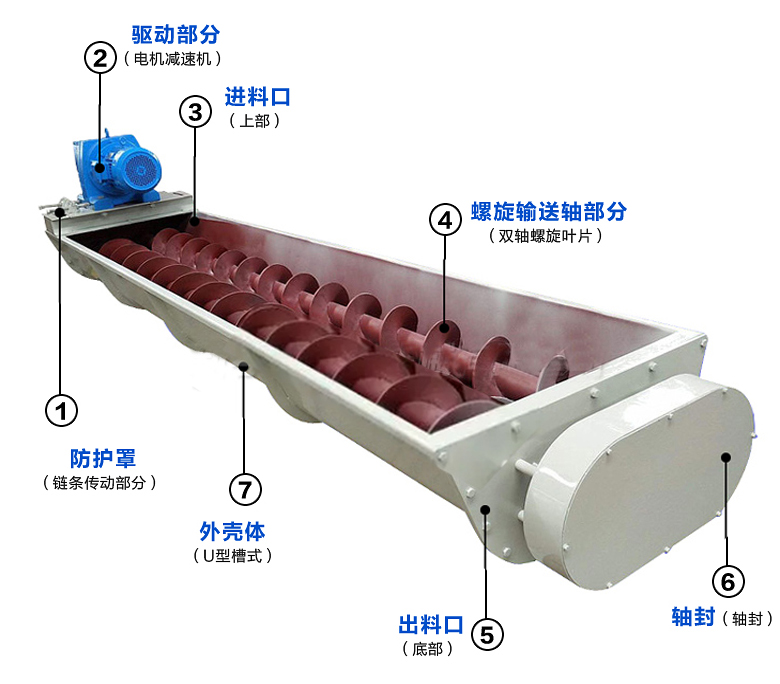 兩螺旋葉片旋向相反,物料不堵塞具備破碎、攪拌功能輸送量比單軸大